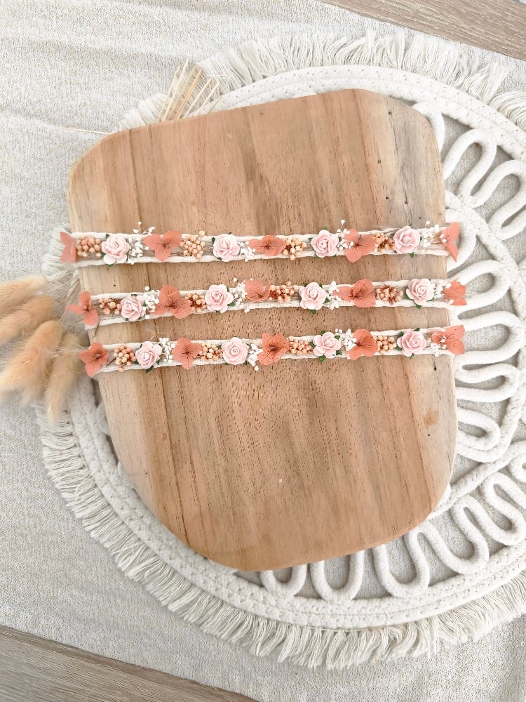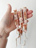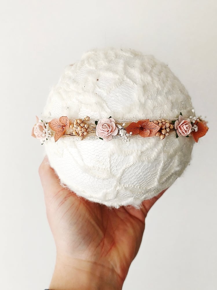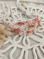 Halo nouveau né bohème ton écru et peche en fleurs séchées.