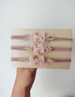 Headband dans les tons pêche, doux et extensible. Parfait pour vos shootings newborn ou sitter. S'adapte à tous les tours de tête.